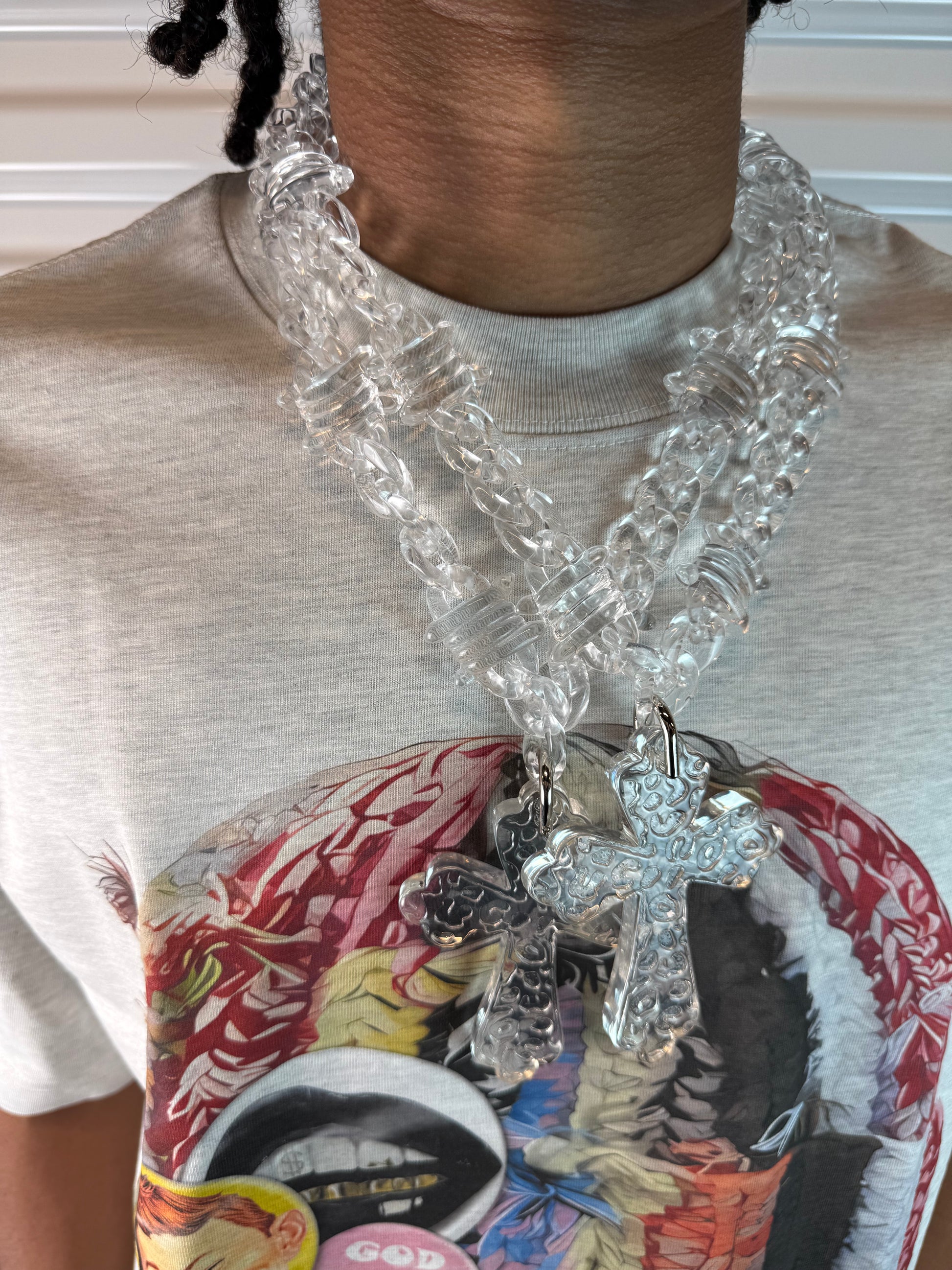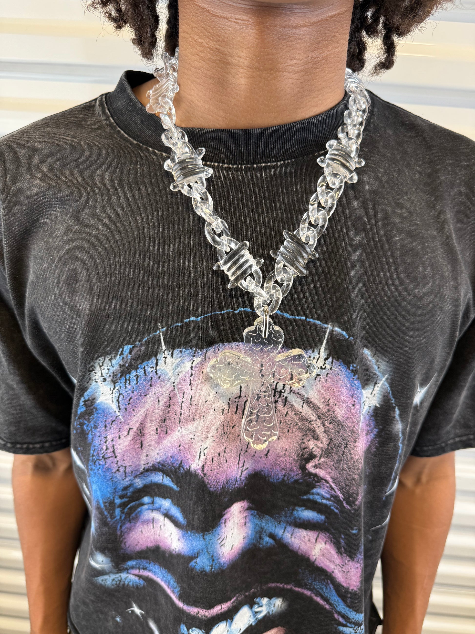 This unique necklace features a barbed cross link design, making it a bold statement piece for any outfit. Show off your style with this eye-catching accessory.